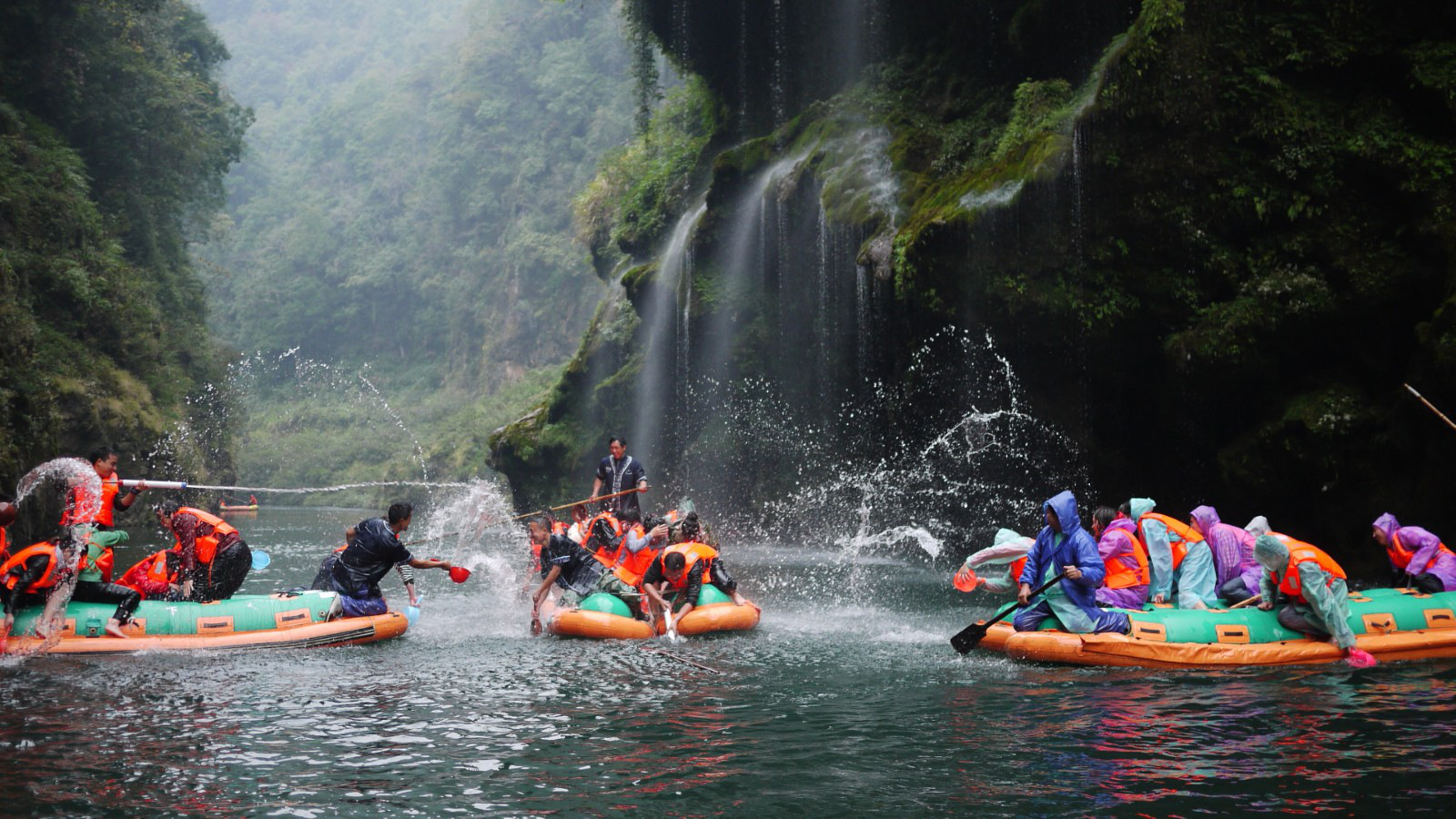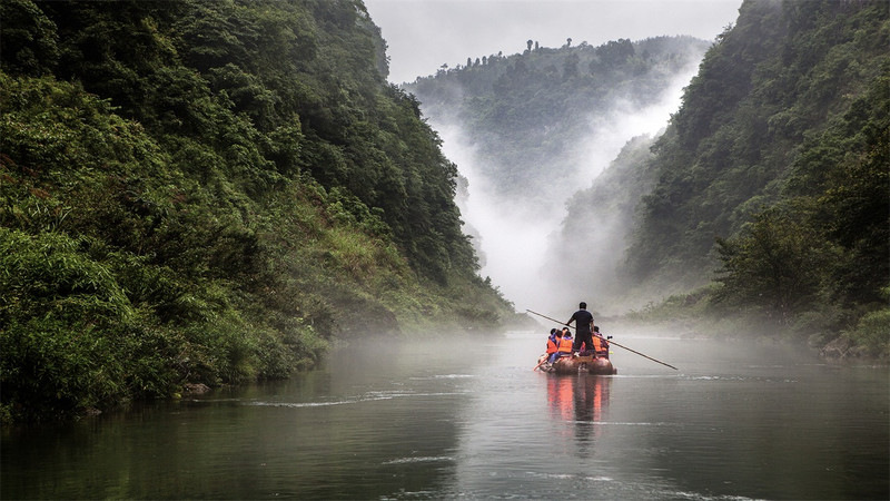 天下第一漂,起点哈妮宫距王村约40公里,行车1小时,终点牛路河距王村30分钟的车程,漂流水路长17公里,漂流两个半小时。从哈妮宫放舟而下,一路是古老的河道,绝壁百里,怪石嶙峋,滩奇水异,两岸苍翠的林木,云雾缭绕,飞瀑流泉与溶岩峰林交相辉映。拐一百五十五个弯,在一百三十三个滩潭中穿梭而行,迂回流连,驰魂奔魄,心旷神怡。