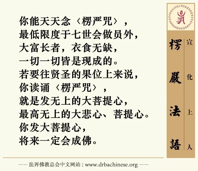 还有,我们要能会念〈楞严咒〉,天天受持〈楞严咒〉,在七世之中都可以有做员外的福报,也就是太平绅士,或者做最有钱、有地位那样的人,有大势力的,在七生中都是这样子。所以你要求人天的福报应该念楞严咒,你要求圣人的福报也应该念楞严咒。