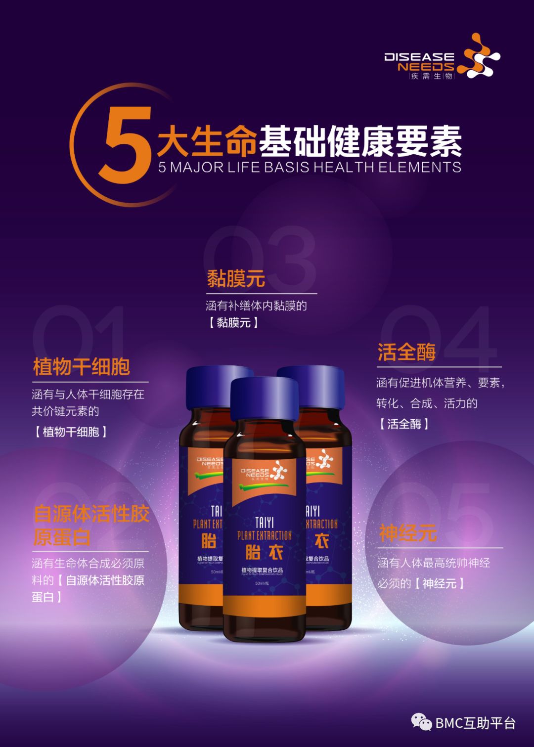 胎衣原液产品内涵 5 大元素。①植物干细胞 ②疫生菌 ③自源体胶原蛋白 ④黏膜元 ⑤神经元 ⑥十全大补元素。是真正的是三维立体生态医学产品!