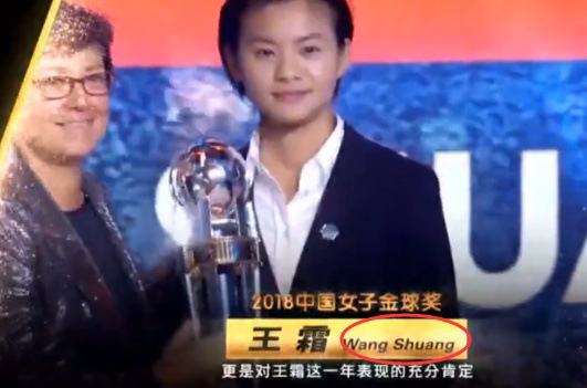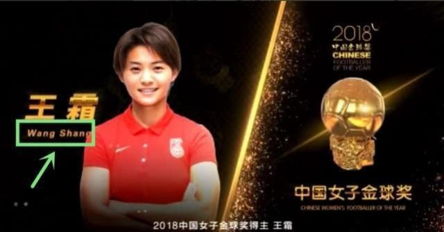 这样的错误显然很不应该,这是基本的常识。然而,到了真正颁奖的这一天,又出现了新的错误。王霜毫无争议的拿到女子金球奖,这是她连续两年当选中国女子金球奖,但是她的名字又被写错了。在视频介绍里,王霜的名字拼写还是对的,但是在关键的海报上,王霜的名字被写成了wangshang,这样的错误让人更加尴尬。