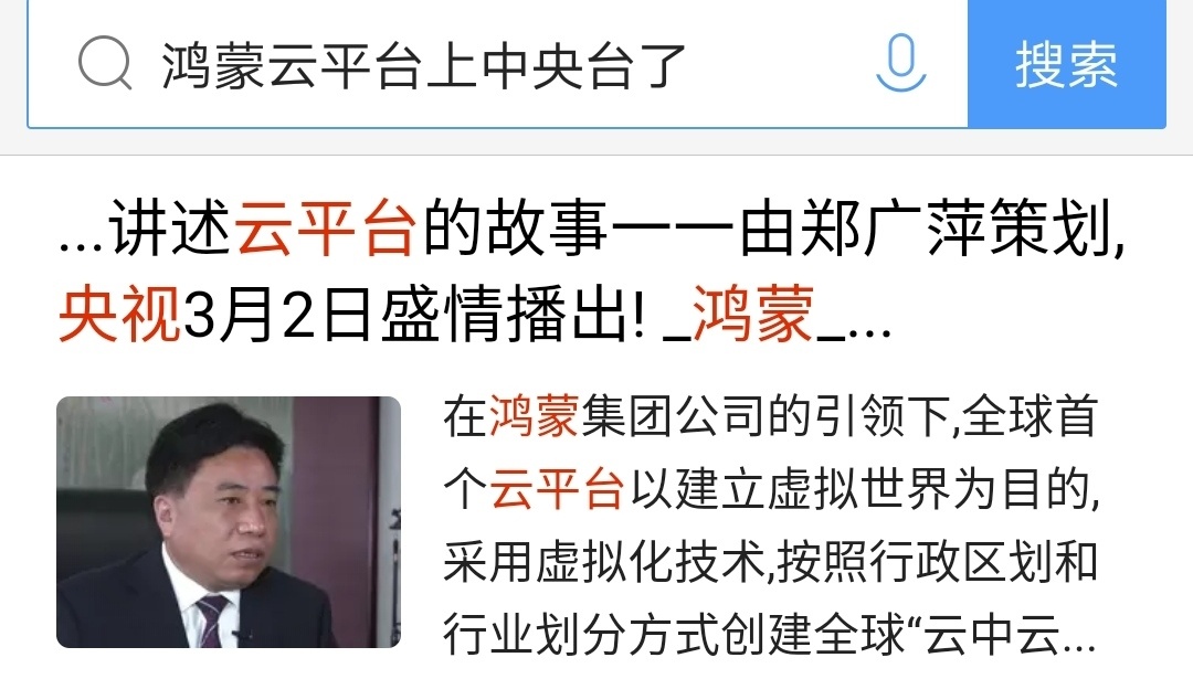 鸿蒙"首个云平台”的核心技术主要包括:无限分层信息遗传技术、海量信息数据库管理技术、搜索引擎目标优化技术。而‘’ 搜索引擎目标优化技术‘’,则是当今向全球推广信息的最先进的新媒体发布工具。