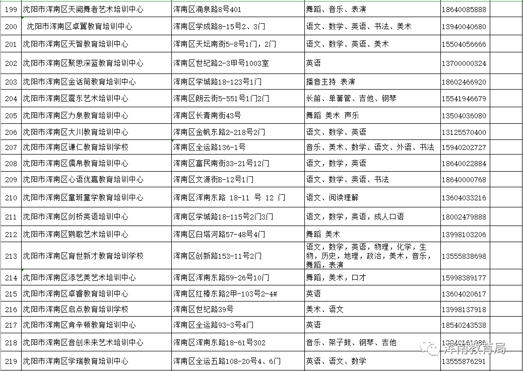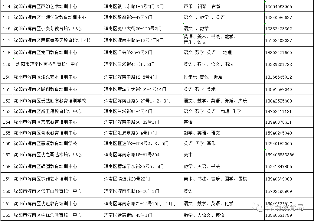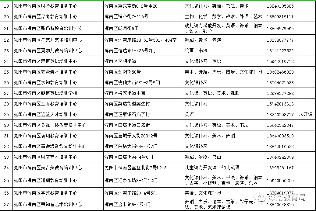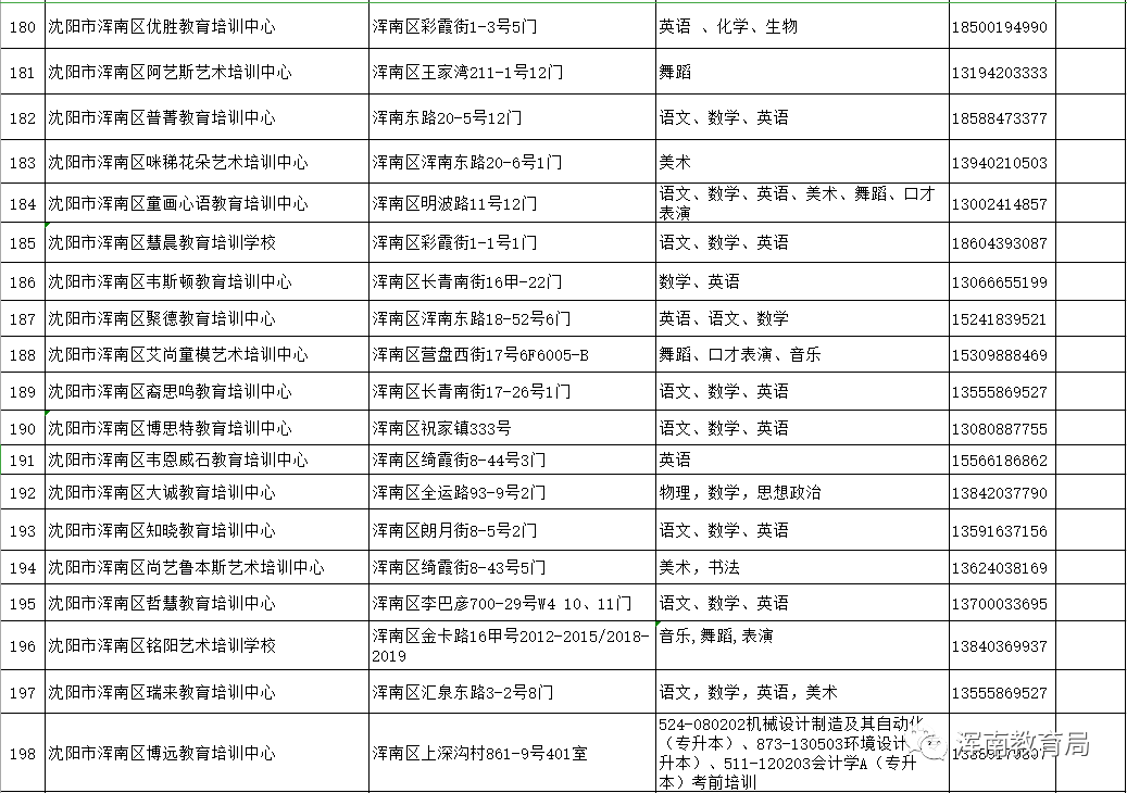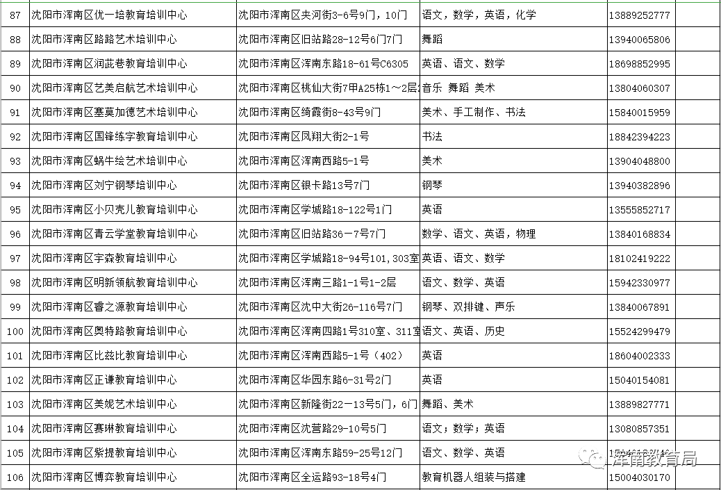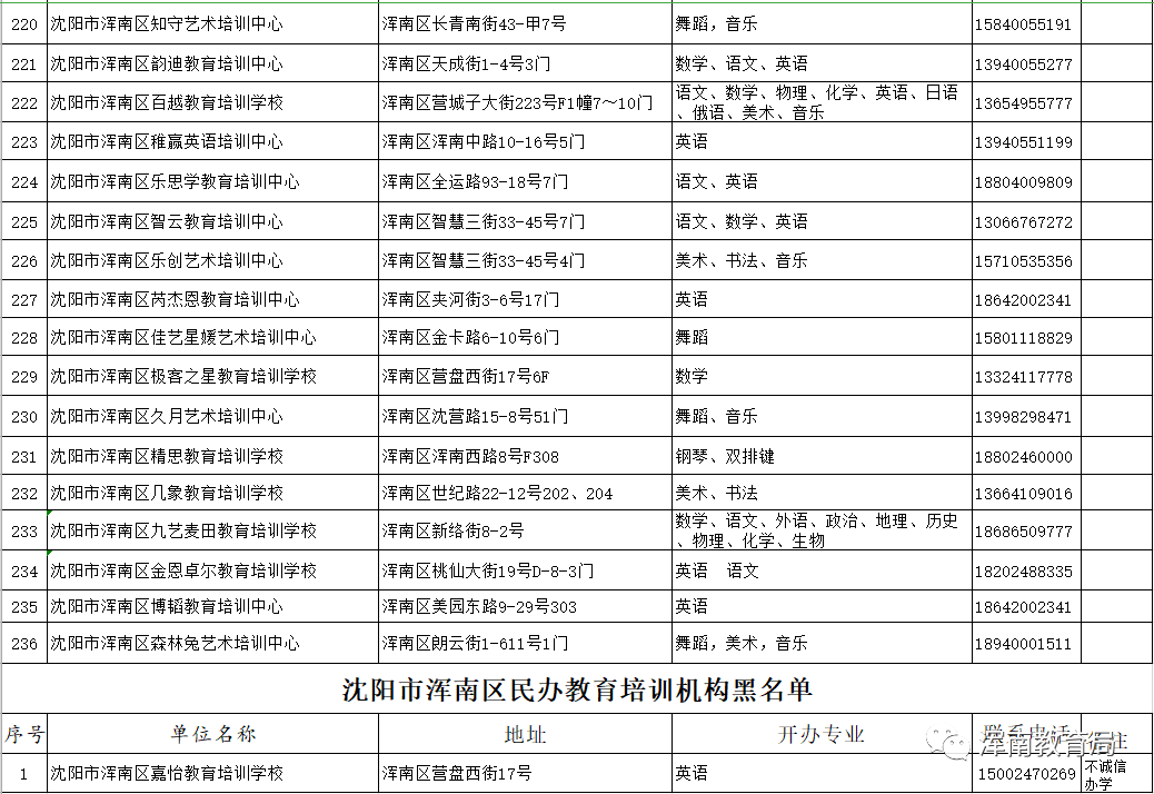 秋季开学之际,浑南区教育局将区内合法办学的校外培训机构黑白名单予以公布,供大家参考、选择。