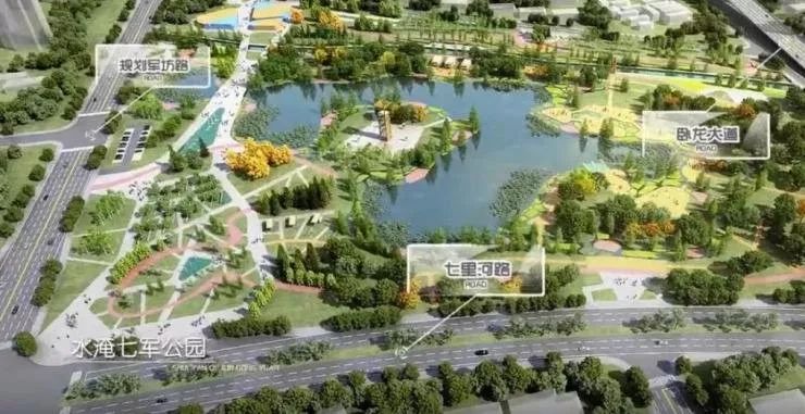 水淹七军公园,位于卧龙大道和七里河路交叉口西北角,占地面积约21公顷,以三国时期“水淹七军”的故事为主题,打造花海户外运动区,三国文化展示区和湿地浮岛游赏区。花海户外运动区位于大李沟两岸以花海游赏、户外运动为主;三国文化展示区将在园区的主入口建成战鼓广场、群英会广场和关羽习武校场;湿地浮岛游赏区将建成水域面积约3.4公顷的湿地,同时设置7个小岛隐喻“水淹七军”中的七军。
