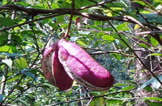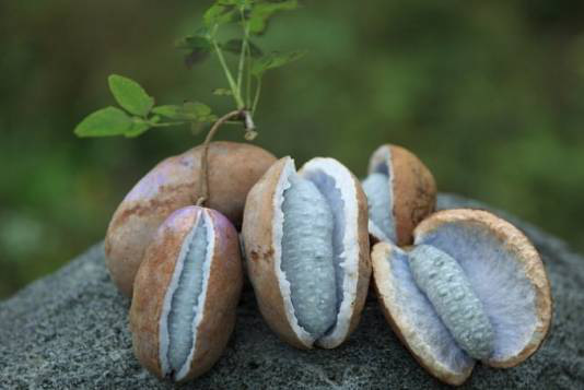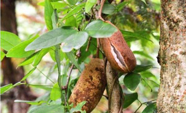 八月瓜,又名野香蕉、牛腰子,中药名称“预知子”。是多年生常绿藤本植物,生长在密林危岩间,五、六月开花结果,果皮淡绿色,农历八月开始成熟,故名八月瓜。