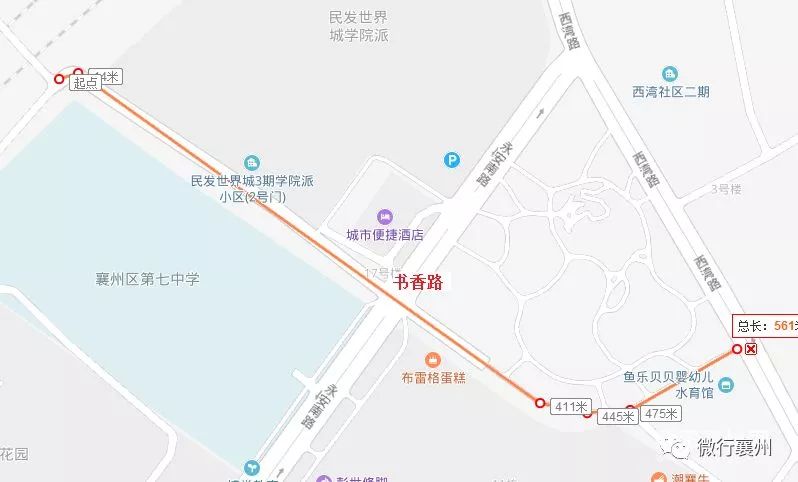 此路位于西湾社区襄州七中与学院派小区之间,长约550米,宽约9米,西起林荫路,向东南延伸至民发世界城三期东门折向东北止于西湾路。因该路位于襄州七中侧面,为弘扬读书学习好风气,故命名为书香路。