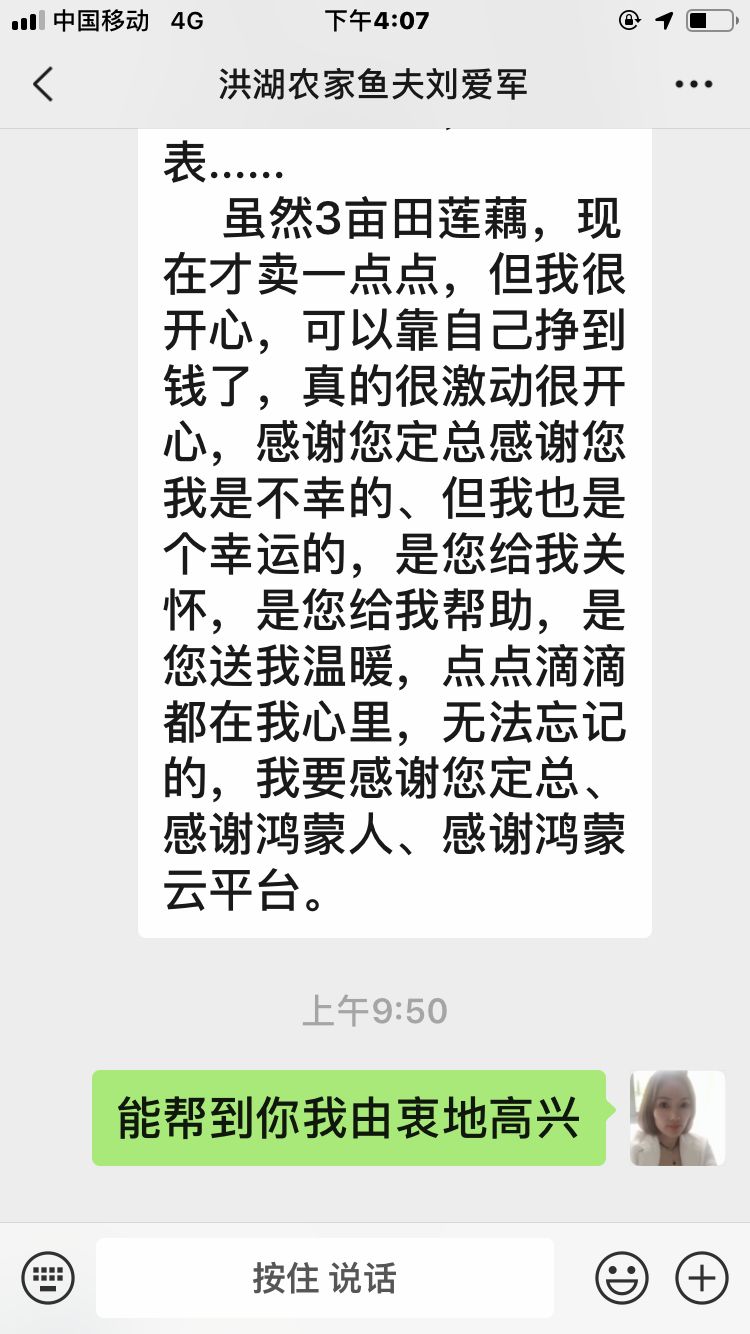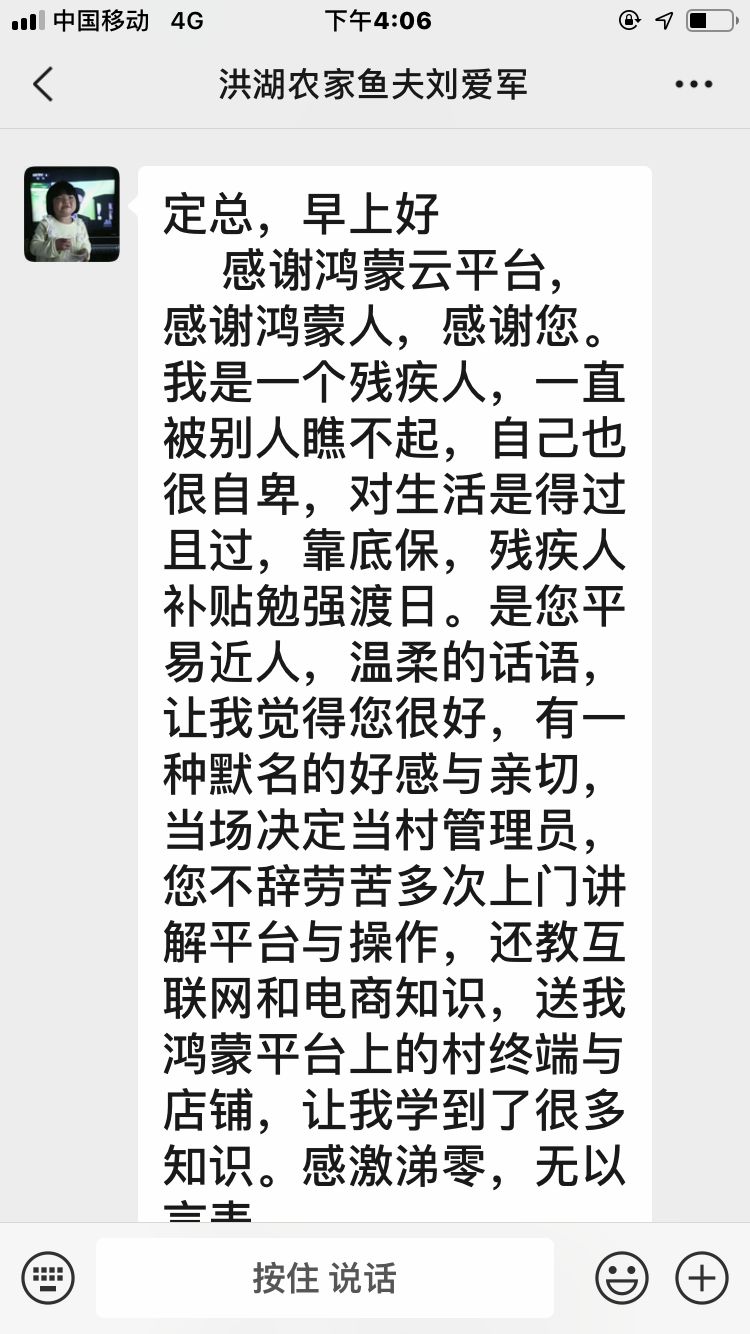 用他自己的话说:我是不幸的,我又是幸运的。今年年初,刚好洪湖市诚云网络科技有限公司(以下简称诚云科技)要在沙洲村为鸿蒙云平台(首个云平台•国家公共服务平台)选一名村级站站长。村书记刘坤成就把刘爱军推荐给了诚云科技的定莲群董事长,双方交谈中,定总对他的乐观精神和上进心很是欣赏,决定义务支持他电商创业!从此,刘爱军就与诚云科技,与鸿蒙云平台,与以定董为代表的鸿蒙人结下了深厚的革命友情!