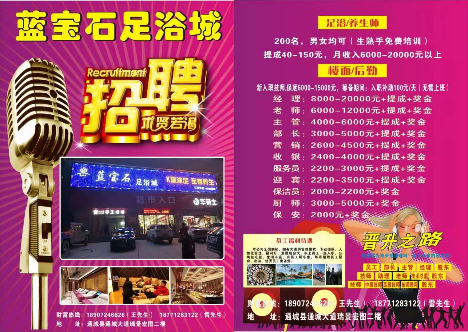 蓝宝石足浴城面向社会招聘优秀人员!专业的营销团队,全新的营业模式,只要您想挣钱,有梦想,蓝宝石将是成就您梦想的港湾!期待您的加入!(包吃住)联系方式:18907246626王先生,13923731577吴经理!地址:通城县通城大道瑞景宏图二楼(客运站斜对面)