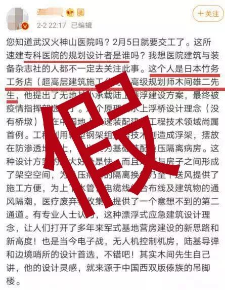 经查证,日本并无此人,也不存在“竹务工务店”。火神山医院的设计者是2003年SARS疫情时期北京“小汤山医院”的总设计师、中国中元顾问首席总建筑师黄锡璆。