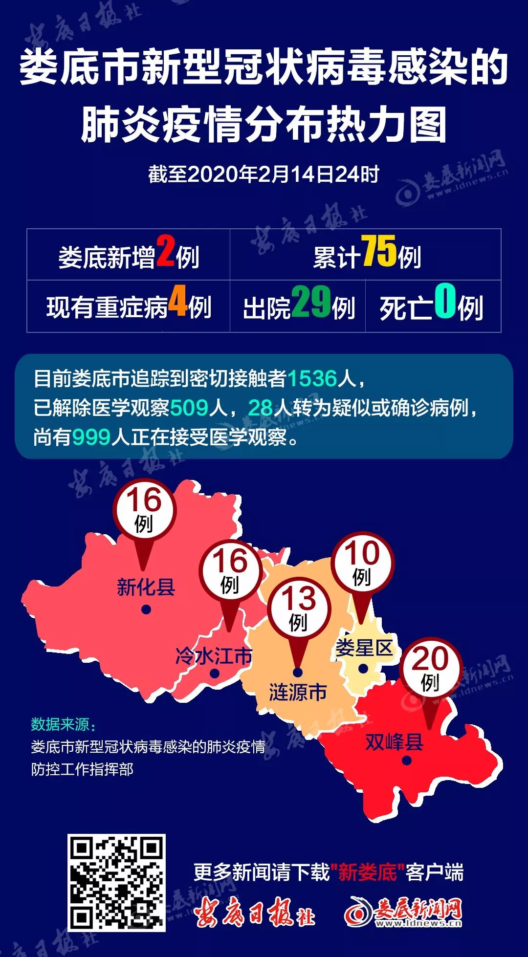 2020年2月15日0-24时,娄底市报告新冠肺炎新增确诊病例0例,新增重症病例1例,新增死亡病例0例,新增出院病例5例。截至2月15日24时,娄底市累计报告新冠肺炎确诊病例75例,现有重症病例5例,死亡病例0例,治愈出院病例34例。确诊病例中,娄星区10例(大科街道4例、蛇形山镇2例、乐坪街道1例、杉山镇1例、双江乡1例、石井镇1例)、冷水江市16例(禾青镇4例、渣渡镇4例、冷水江街道2例、三尖镇2例、中连乡2例、沙塘湾街道1例、铎山镇1例)、涟源市13例(金石镇6例、伏口镇2例、桥头河镇2例、石马山镇1例、龙塘镇1例、枫坪镇1例)、双峰县20例(永丰街道12例、青树坪镇3例、甘棠镇2例、梓门桥镇2例、印塘乡1例)、新化县16例(槎溪镇4例、洋溪镇3例、炉观镇4例、上渡街道1例、坐石乡1例、孟公镇1例、琅塘镇1例、桑梓镇1例);重症病例中,冷水江市3例(中连乡1例、三尖镇1例、禾青镇1例),新化县1例(琅塘镇)。