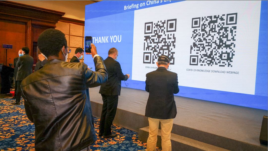 在现场,谭主也发现了中方的贴心周到。像这样的二维码随处可见,扫描后就能够下载英文版的《新型冠状病毒肺炎诊疗方案(试行第七版)》、《新型冠状病毒肺炎防控方案(第六版)》、各类最新研究成果,以及各省市防疫经验报告等等。