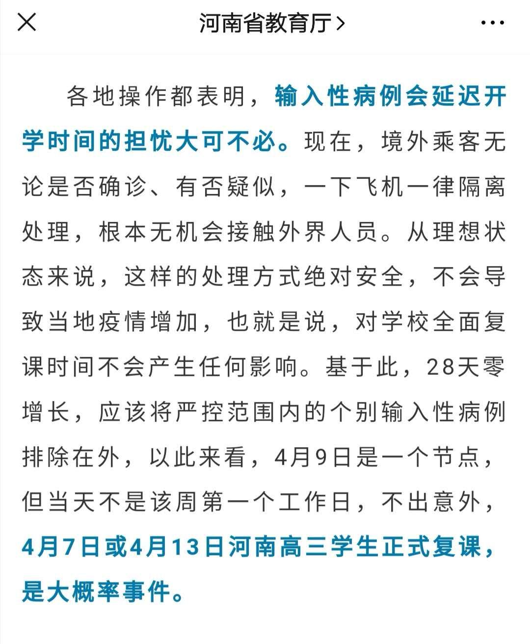 4月9日是一个节点,但当天不是该周第一个工作日,不出意外,4月7日或4月13日河南高三学生正式复课,是大概率事件。