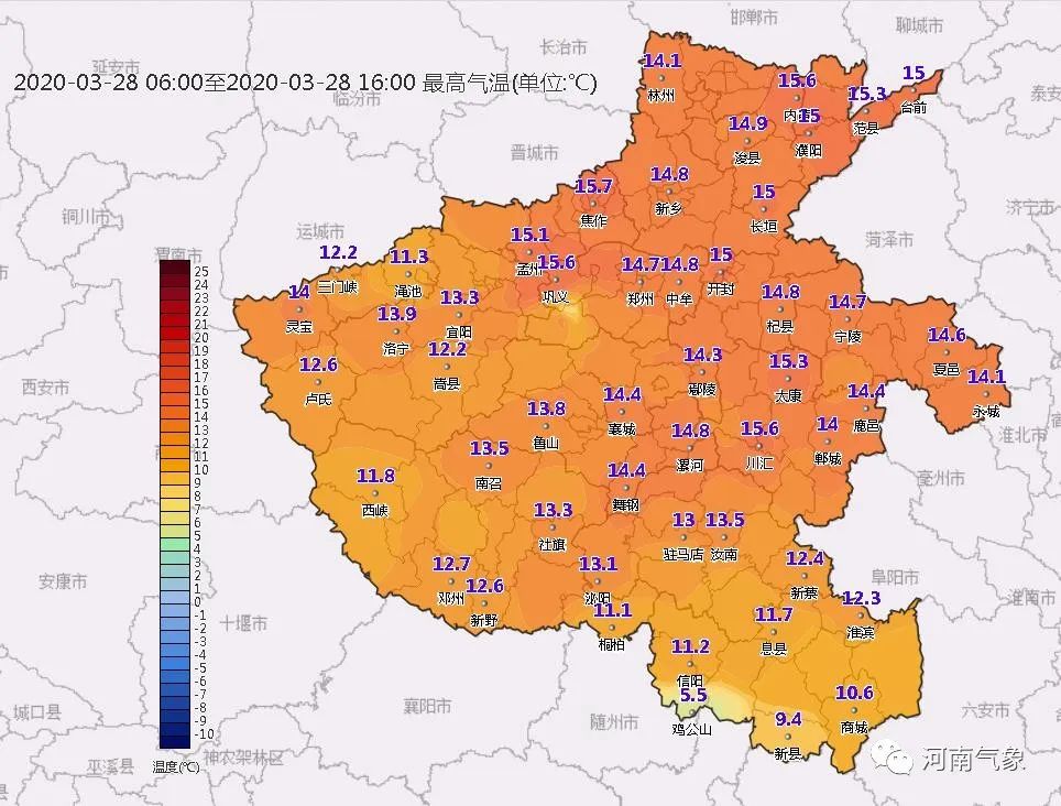 今天,黄河以南地区大部有降水,受其影响,最高温度低迷,而北部由于天空状况较好,温度相比今天没有明显变化;
