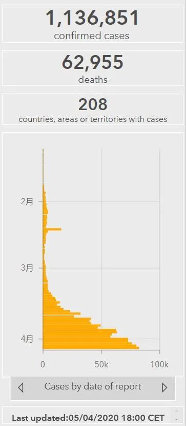 世卫组织实时统计数据显示,截至欧洲中部时间4月5日18时(北京时间4月6日0时),目前全球已有208个国家和地区出现新冠肺炎确诊病例,中国以外超过105万例。