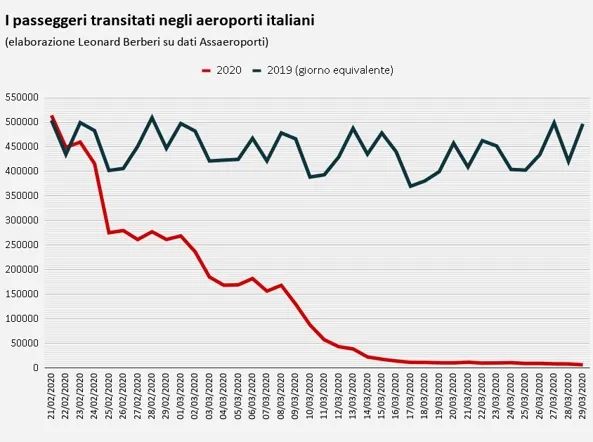 2020年全年意大利机场将损失1亿3千万人次客流,同比下降67.3%。