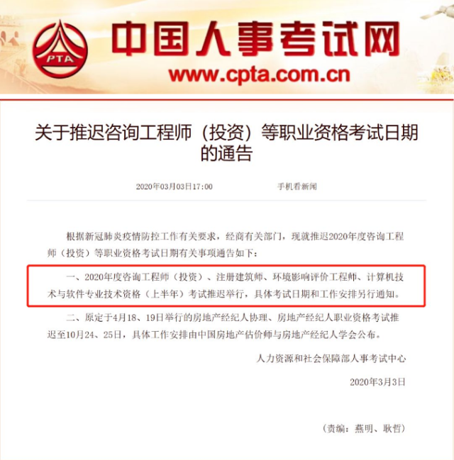 咨询工程师(投资)、注册建筑师、环境影响评价工程师、计算机技术与软件专业技术资格(上半年)考试推迟举行,具体考试日期和工作安排另行通知。