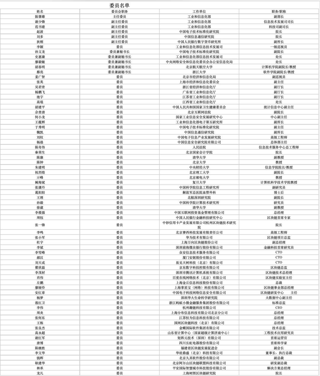 公示名单包含政、产、学、研等机构的71人,其中主任委员1名,由工信部副部长陈肇雄担任,另有五位副主任委员、一位秘书长和四位副秘书长。副主任委员中,包含中国人民银行数字货币研究所副所长狄刚。