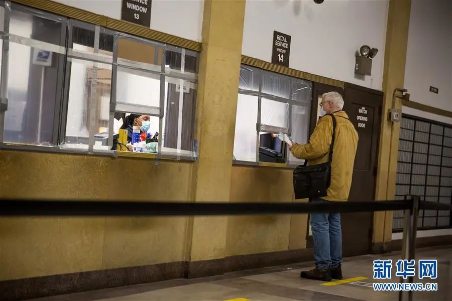4月13日,在美国纽约,一名邮局员工(左)在用塑料布封闭的柜台内工作。