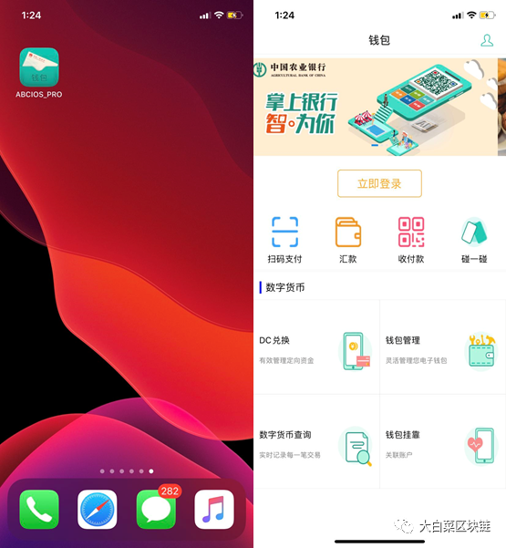 网传中国农业银行正开展数字货币(DCEP)钱包试点,已有泄露出的 App 下载地址,包含苹果和安卓平台。该应用需要开通测试功能的白名单用户才可注册,而且目前仅覆盖深圳、雄安、成都和苏州的特定网点,该测试 App 的短信验证码和 http 访问抓包等都表明和农行有直接关系。App中的快捷方式包含的功能为:扫码支付、汇款、收付款和碰一碰,其他功能包括:DC 兑换(数字货币兑换)、钱包管理、钱包查询和钱包挂靠(关联账户)功能。