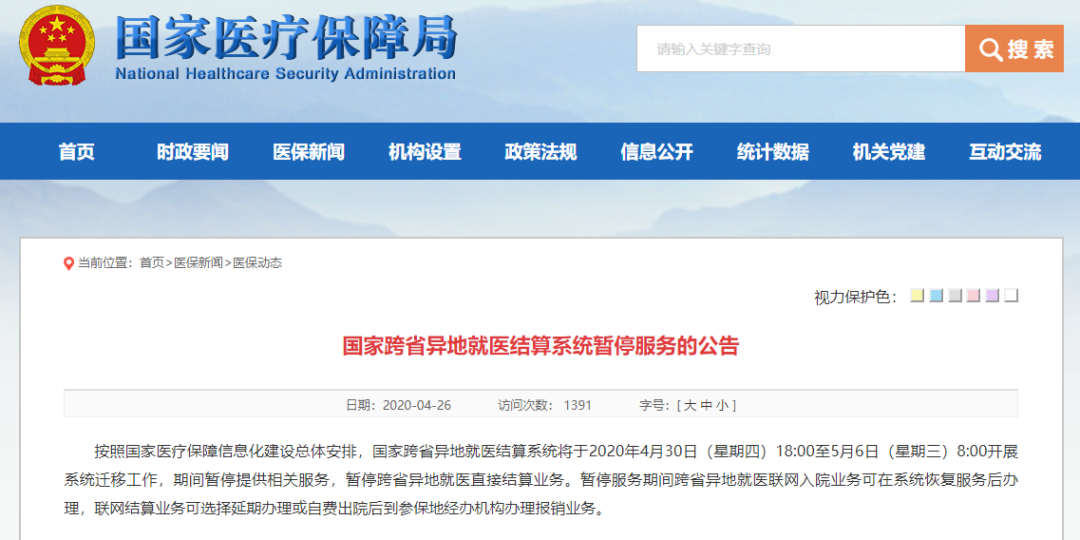 按照国家医疗保障信息化建设总体安排,国家跨省异地就医结算系统将于2020年4月30日(星期四)18:00至5月6日(星期三)8:00开展系统迁移工作,期间暂停提供相关服务,暂停跨省异地就医直接结算业务。暂停服务期间跨省异地就医联网入院业务可在系统恢复服务后办理,联网结算业务可选择延期办理或自费出院后到参保地经办机构办理报销业务。