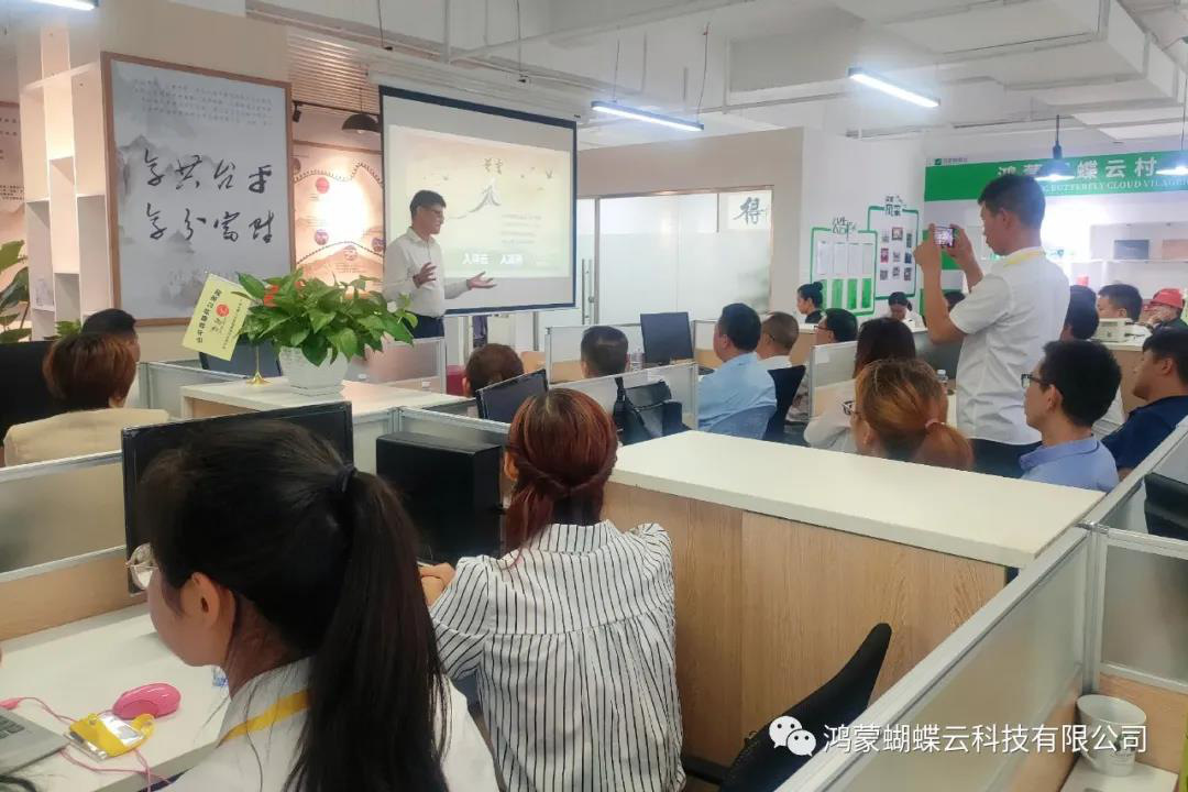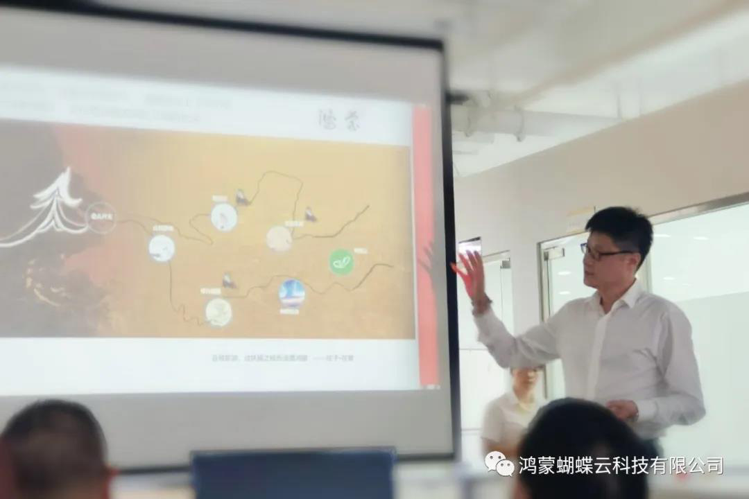 授牌签约仪式后,毛磊先生进行项目培训。以鸿蒙云系统的设计理念、运用场景、实施模式三大点为培训主要内容。以“中国科技设计理念源于中国文化”导入,介绍鸿蒙——“鸿蒙”来源盘古开天以及庄子逍遥游中的蝶化鲲鹏,为“鸿蒙”这一名称来源赋上传奇色彩。毛磊先生演示了鸿蒙蝴蝶云产品,介绍了三线至尊及特色智网,指出“线上全网,线下定位”的特点,再次强调要做到“政府主导,市场运作”,要切实落地实现。此次培训到场人员聚精会神,座无虚席。