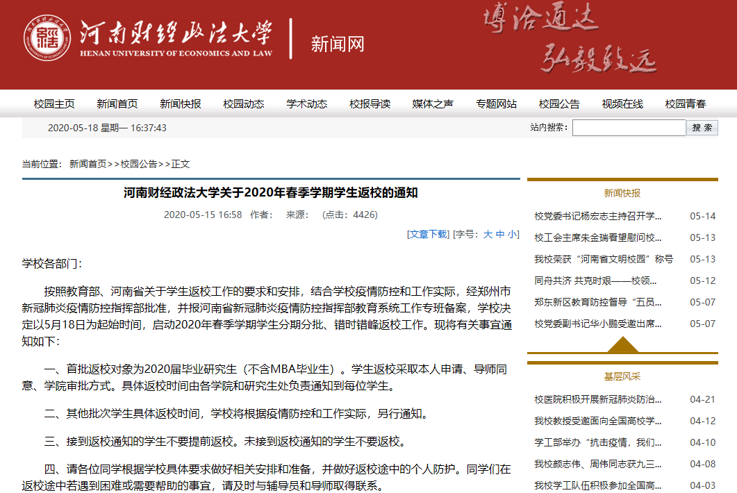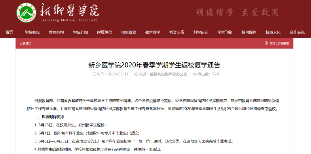 根据教育部、河南省委省政府关于高校复学工作的有关精神,结合学校疫情防控实际,经学校新冠疫情防控指挥部研究、新乡市教育系统新冠肺炎疫情防控工作专班批准,并报河南省新冠肺炎疫情防控指挥部教育系统工作专班备案批准,学校确定2020年春季学期学生从5月25日起分期分批错峰有序返校。