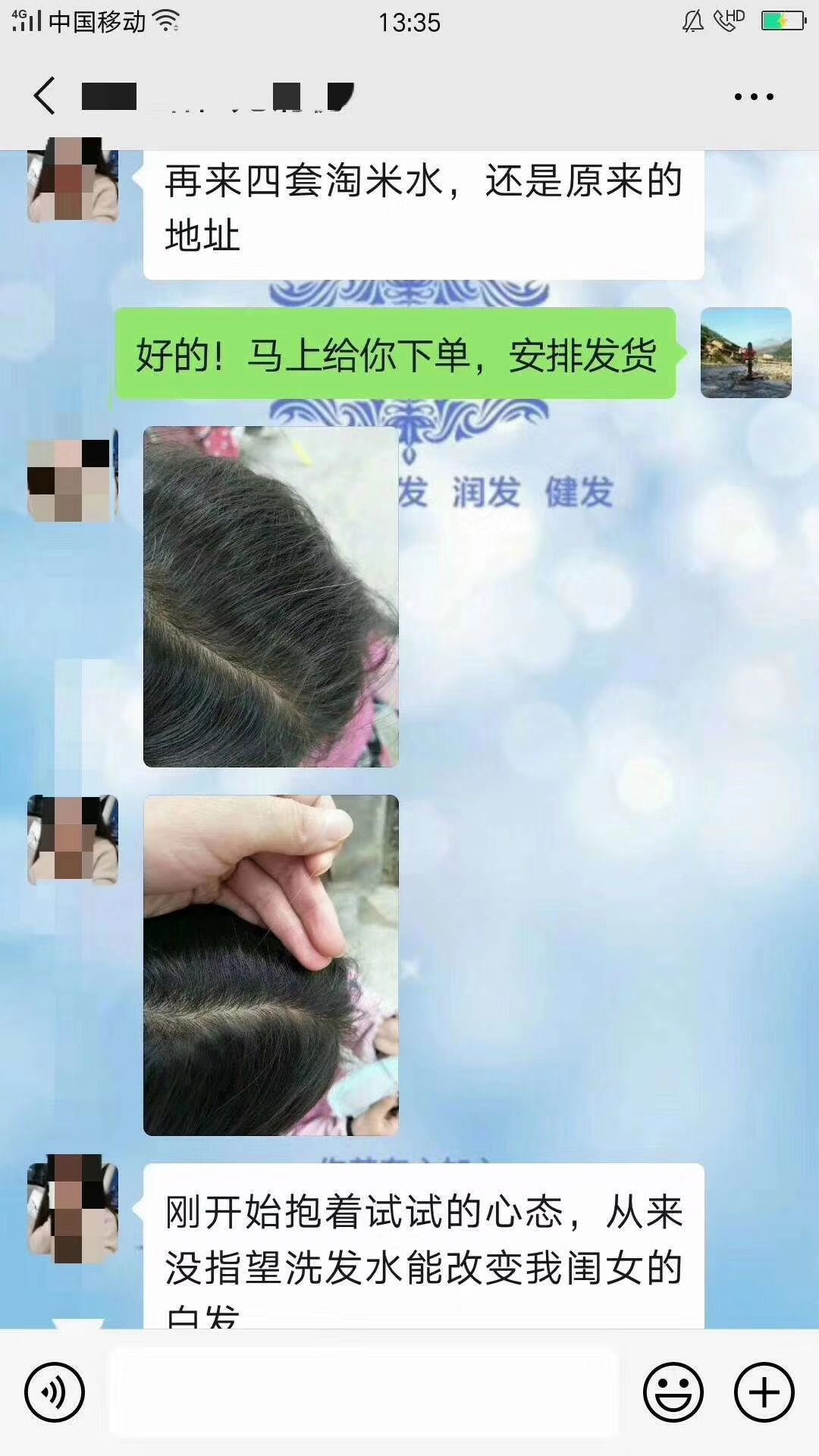 顾客说若不是自己亲身经历,真不敢相信世界上还有这么一款神奇的洗发水,可以让白发转黑