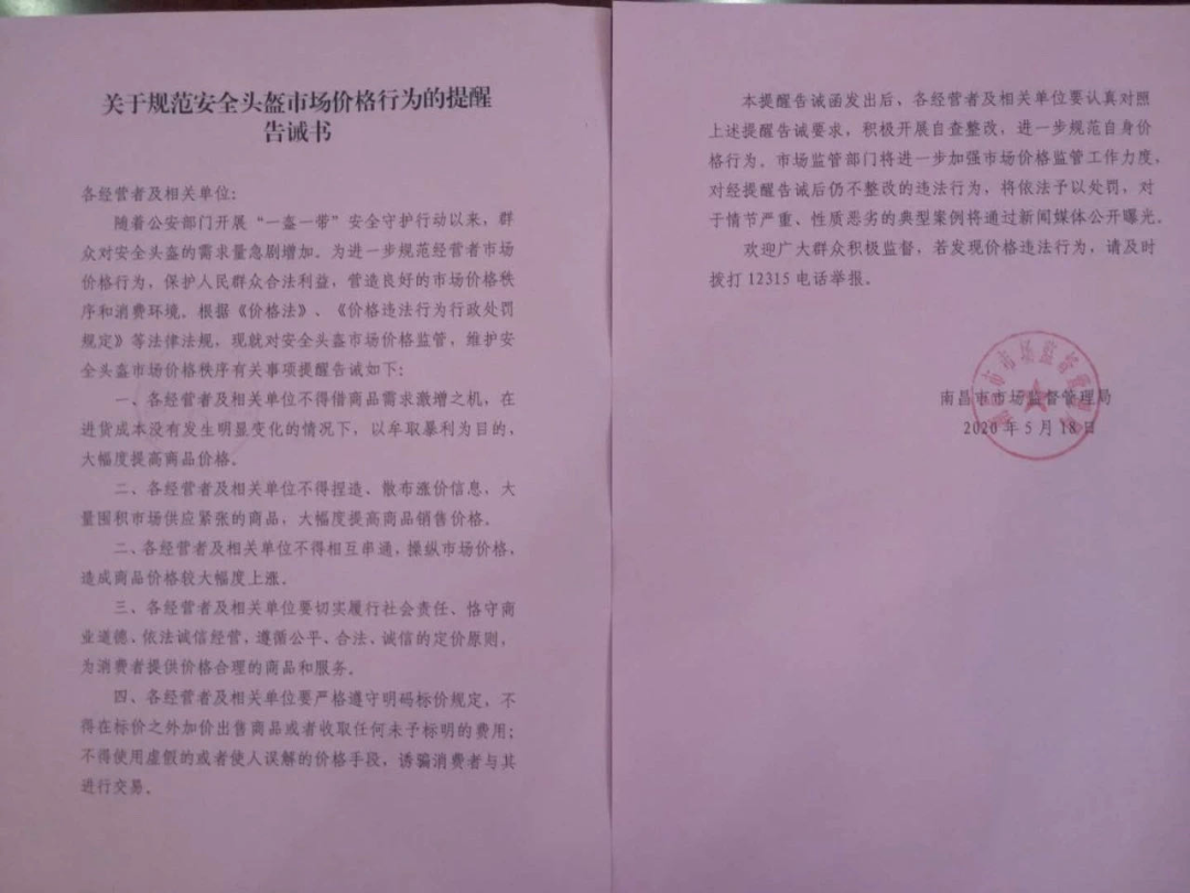 表示,头盔属于价格放开商品,属于市场调节价。如发现价格违法行为,