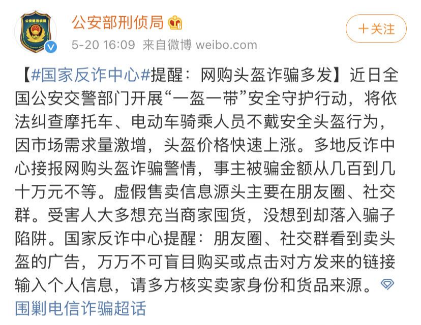 20日,国家反诈骗中心提醒,在朋友圈、社交群看到卖头盔的广告,万万不可盲目购买或者点击对方发来的链接输入个人信息,谨防被骗遭受损失。