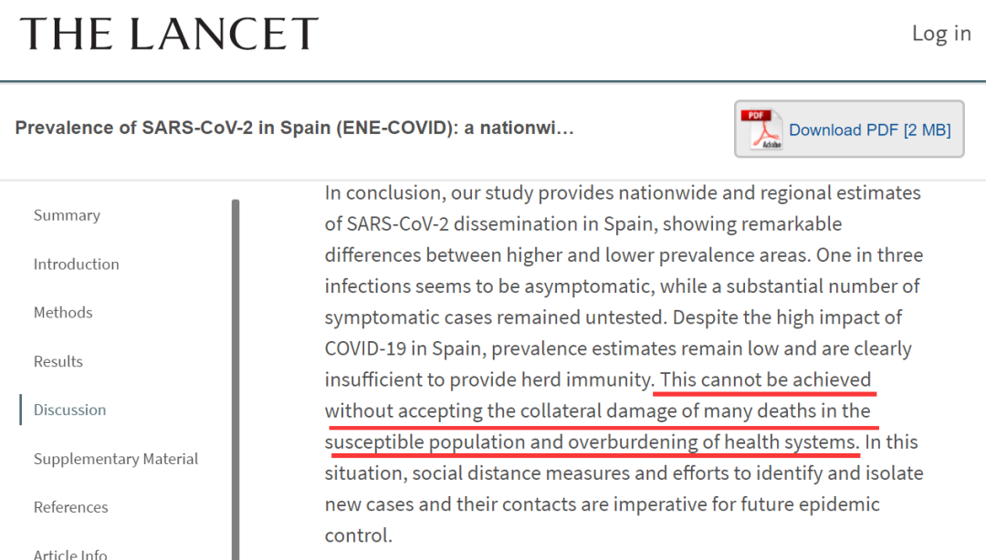 这份论文因此指出:“尽管新冠肺炎给西班牙造成了巨大的冲击,这种病的流行程度看起来还是偏低,明显不足以实现‘群体免疫’。这说明在不造成大量易感人群死亡和医疗系统过载等附带损伤的情况下实现‘群体免疫’,是不可能的。”