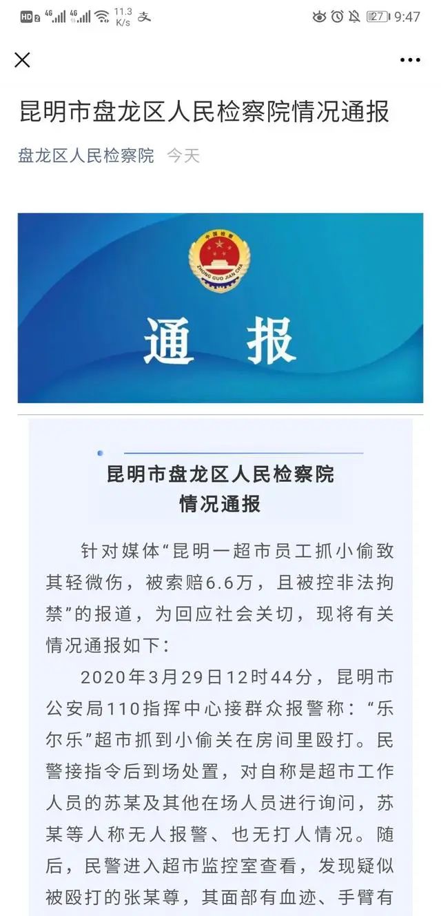 针对媒体“昆明一超市员工抓小偷致其轻微伤,被索赔6.6万,且被控非法拘禁”的报道,为回应社会关切,现将有关情况通报如下: