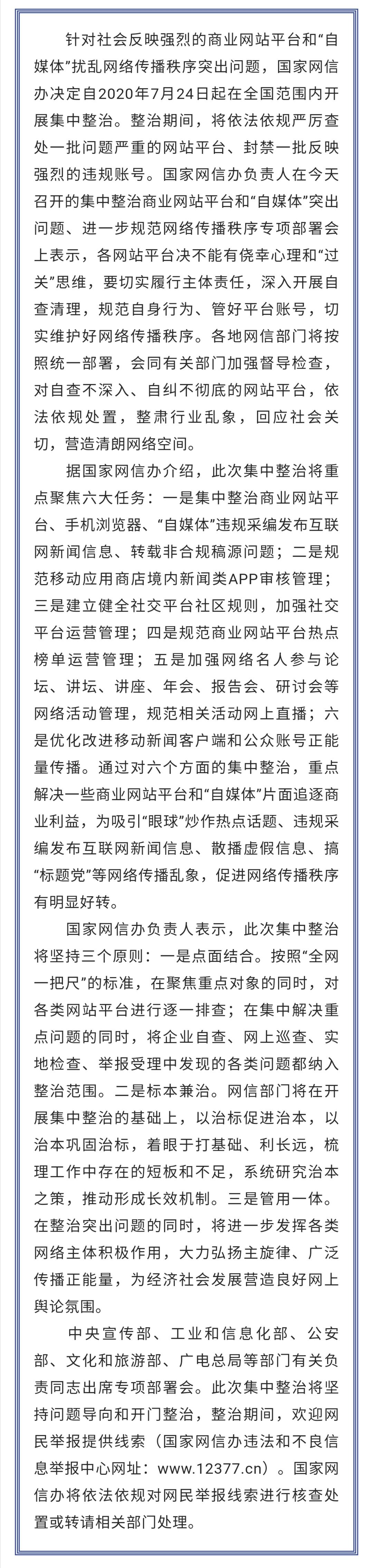 国家网信办针对网络传播秩序突出问题亮利剑出重拳 集中整治商业网站平台和“自媒体”违法违规行为