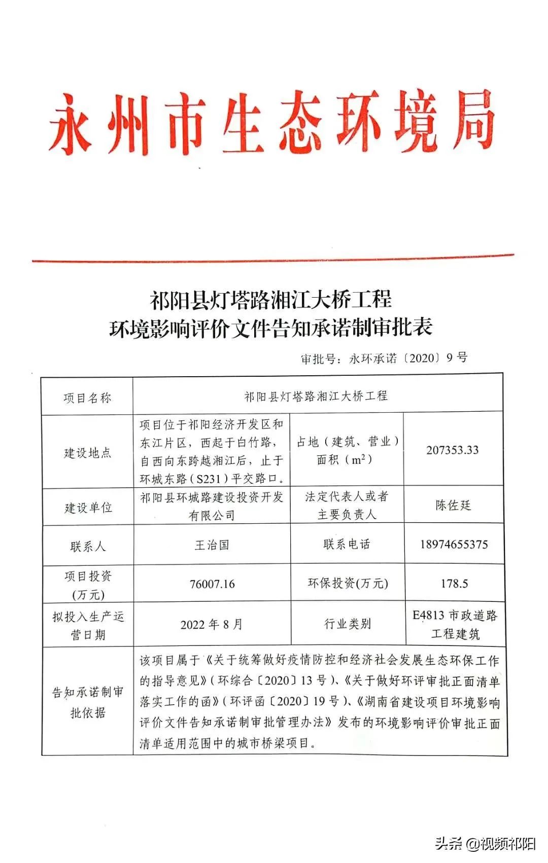 关于对祁阳县灯塔路湘江大桥工程环境影响报告表作出告知承诺制审批决定的公示