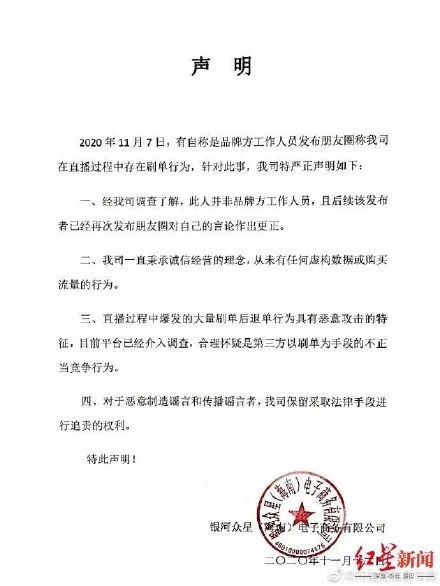 对于此事,汪涵签约方银河众星回应称“这是假的”,公司没有任何虚构数据或购买流量的行为,只是帮该电商平台账号做一次直播执行,没有必要去刷单,这次刷单后退单具有恶意攻击特征。目前平台方正在介入调查,具体攻击源头还未查清。