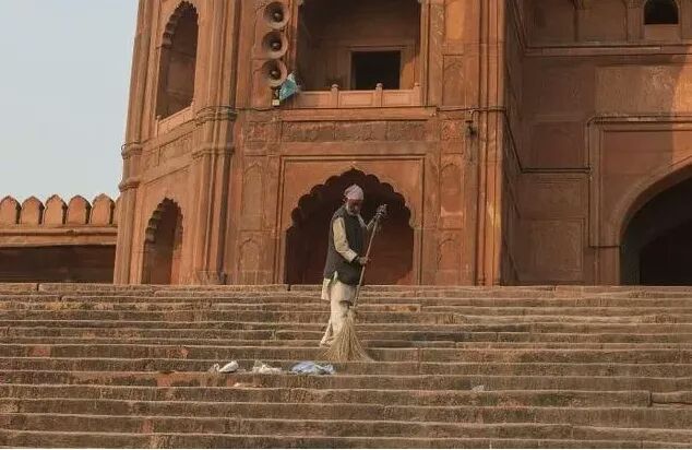 ▲11月2日,在印度新德里,一名清洁工在一座清真寺打扫。新华社发(贾韦德·达尔摄)