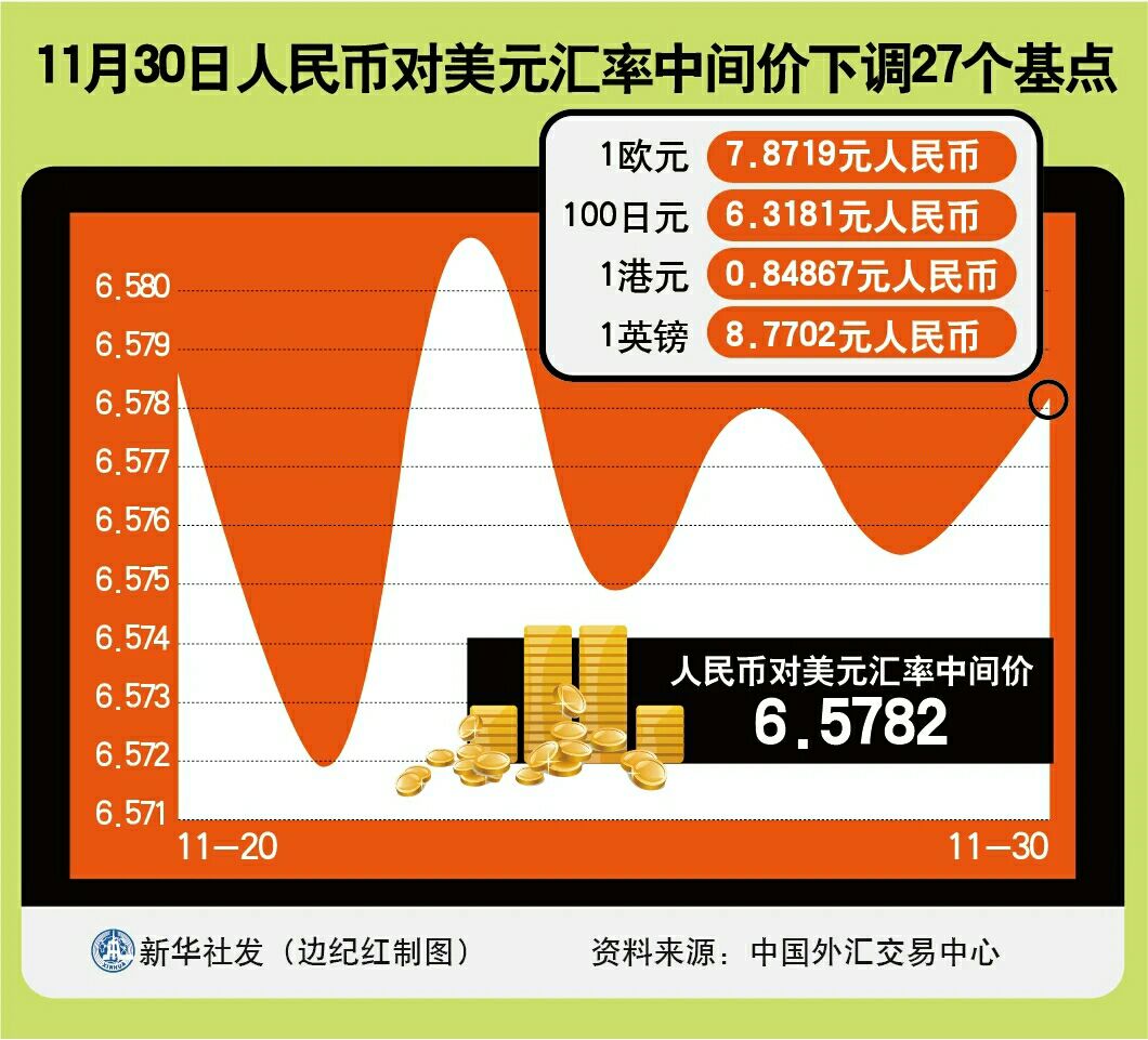 11月30日人民币对美元汇率中间价报6.5782,较前一交易日下调27个基点。