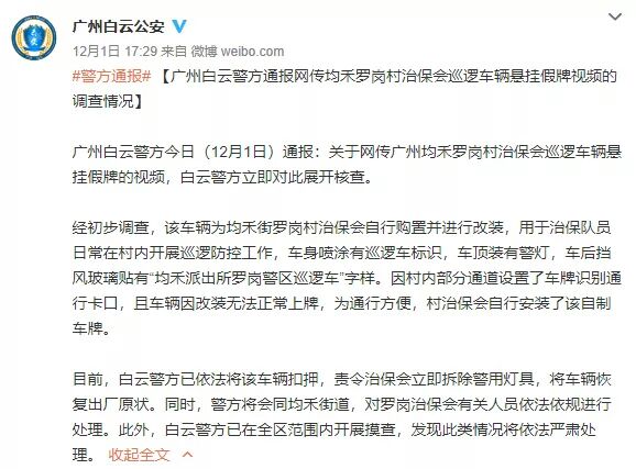 广州白云警方经核查后通报:均禾街罗岗村治保会自行改装了巡逻车并安装了自制车牌,警方已依法将车扣押,责令立即拆除警用灯具,将车辆恢复出厂原状。