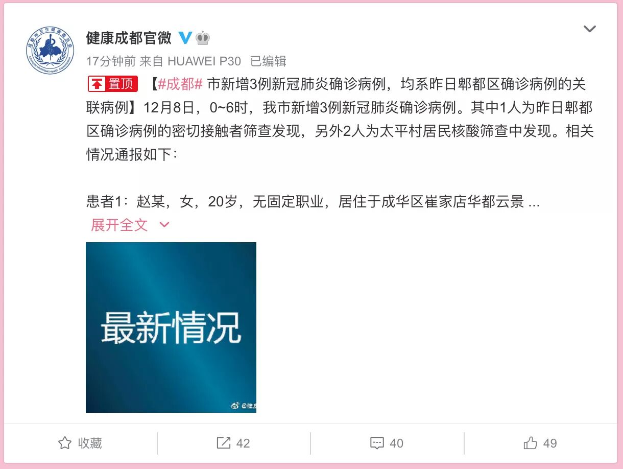 12月8日,成都市新增4例新冠肺炎确诊病例,新增1例新冠肺炎无症状感染者。