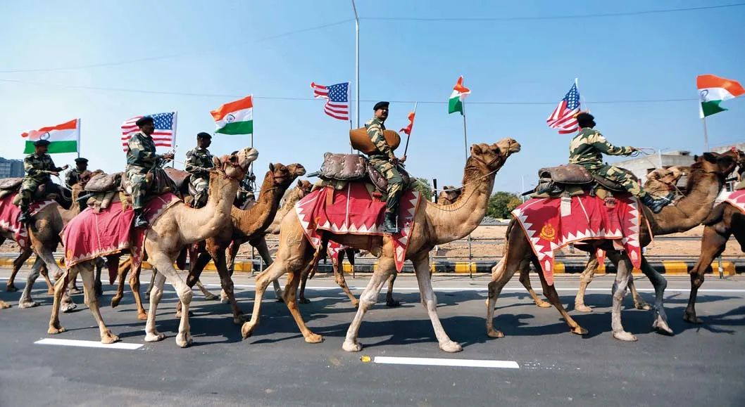美国总统特朗普访问印度前夕,在印度艾哈迈达巴德,安保人员骑的骆驼背上插了美印两国国旗。新华社发
