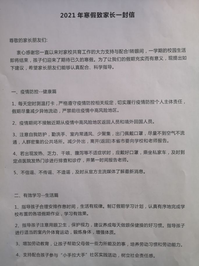 衷心感谢您一直以来对家校共育工作的大力支持与配合!转眼间,一学期的校园生活即将结束,孩子们迎来了期待已久的寒假。为了让我们的假期充实而有意义,现提出如下建议,希望家长朋友们能够认真配合、科学指导。