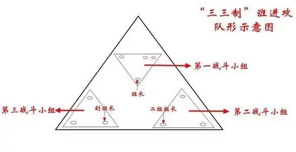 “三三制”的战术标准就是以班为单位分成三个战斗小组,每个小组三个人,呈三角形的攻击方式进行冲锋,组内三人分别担任进攻、掩护和支援的作用,三个战斗小组成品字型自行发起冲锋。