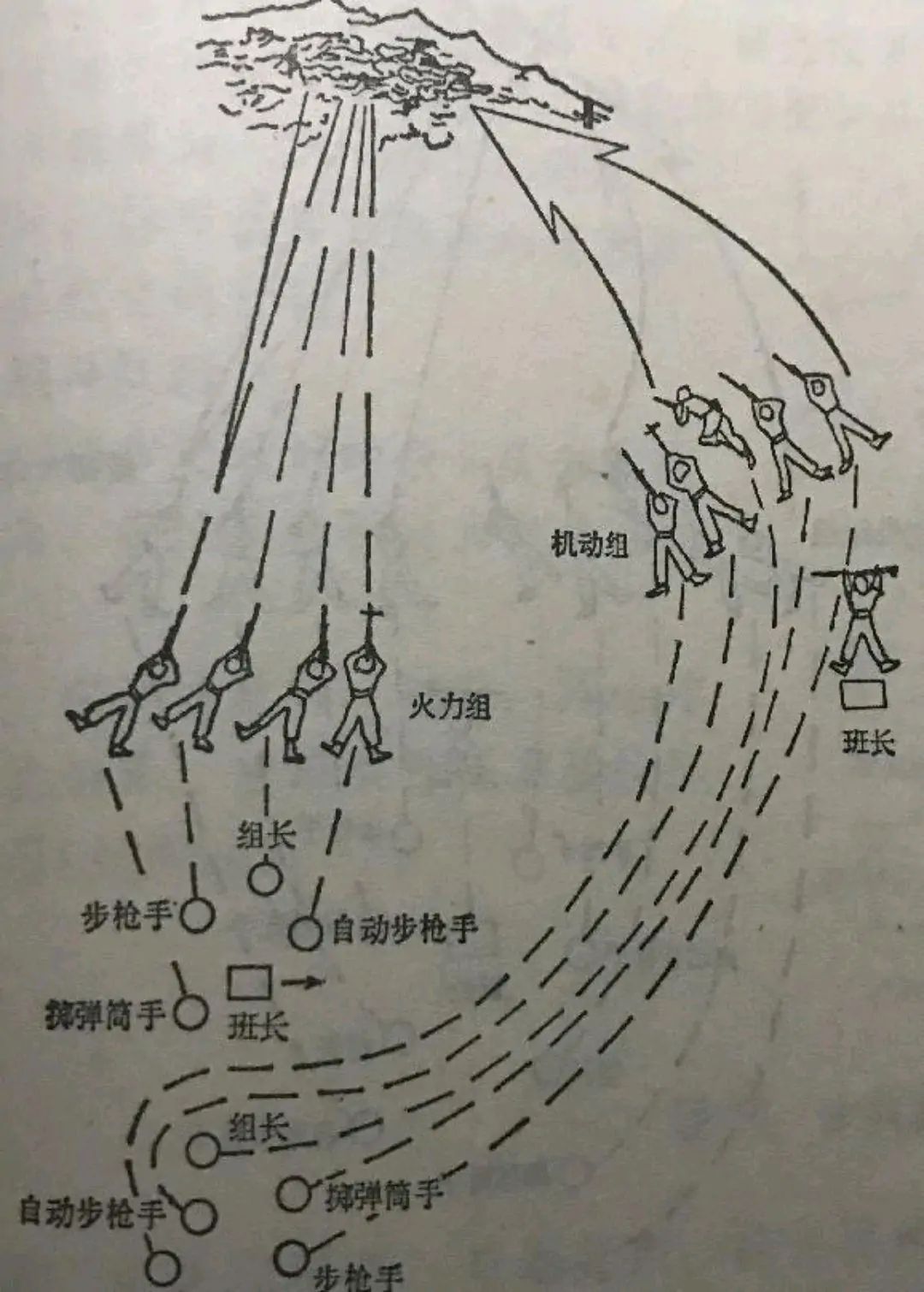 在山坡的一面,两至三个三人攻击小组交替掩护前进,从侧翼迂回。