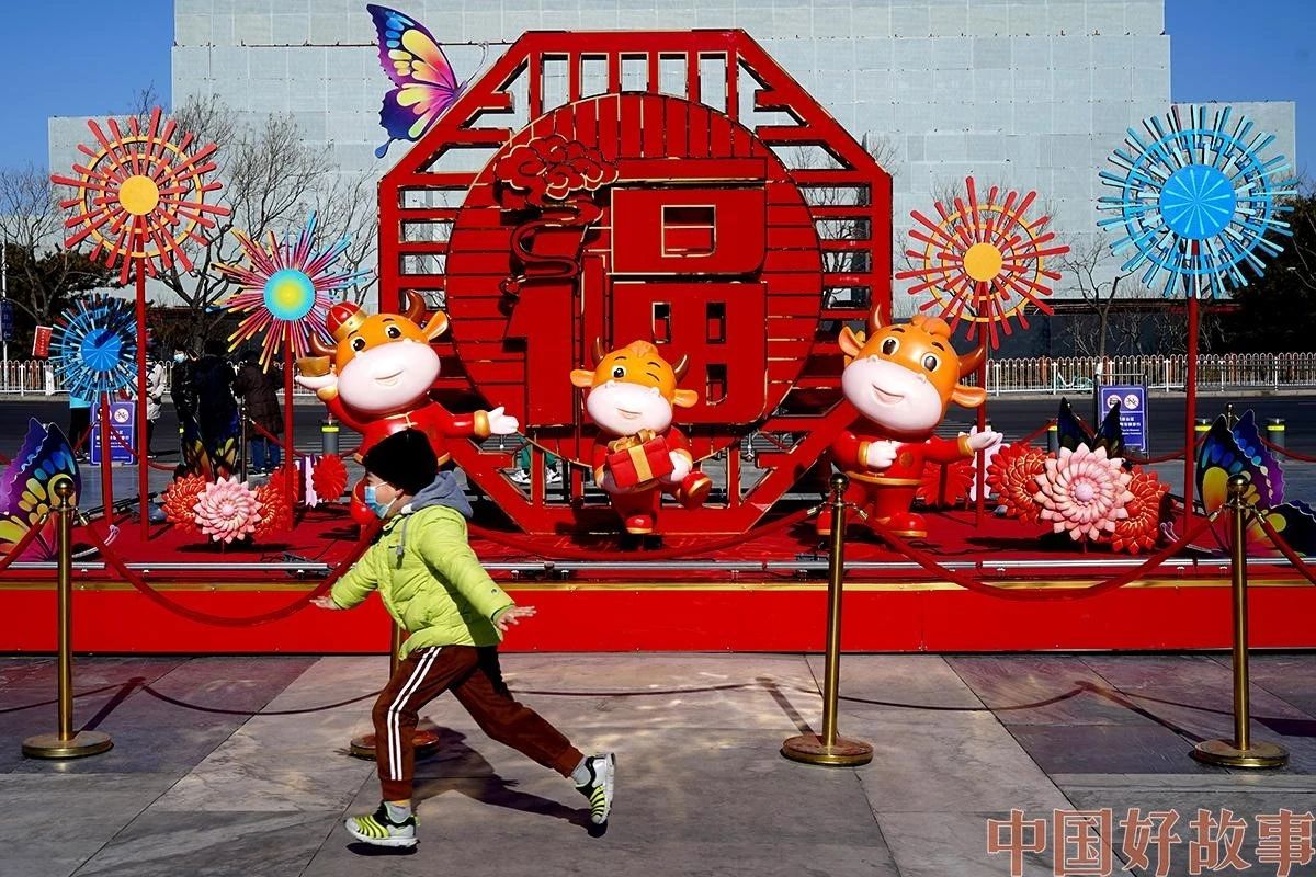 2021年2月1日,北京,小朋友从前门大街“福字”前欢快跑过。宋家儒摄