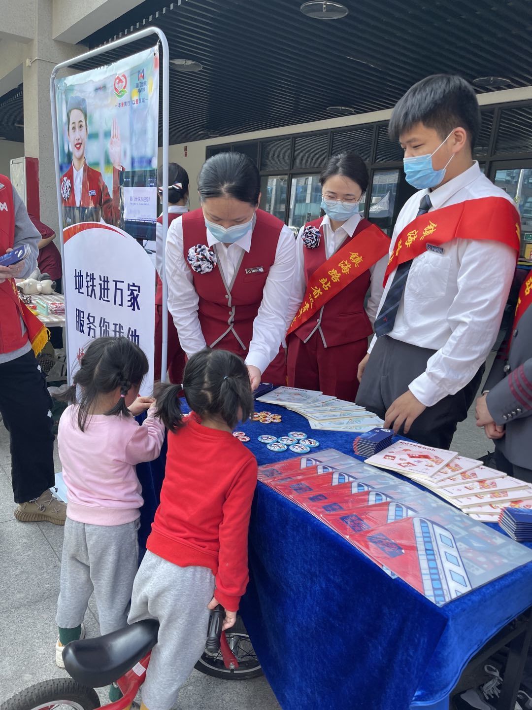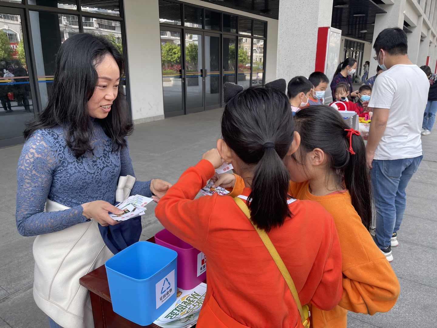 工作人员现场和小朋友讲解垃圾分类的要求和注意事项。