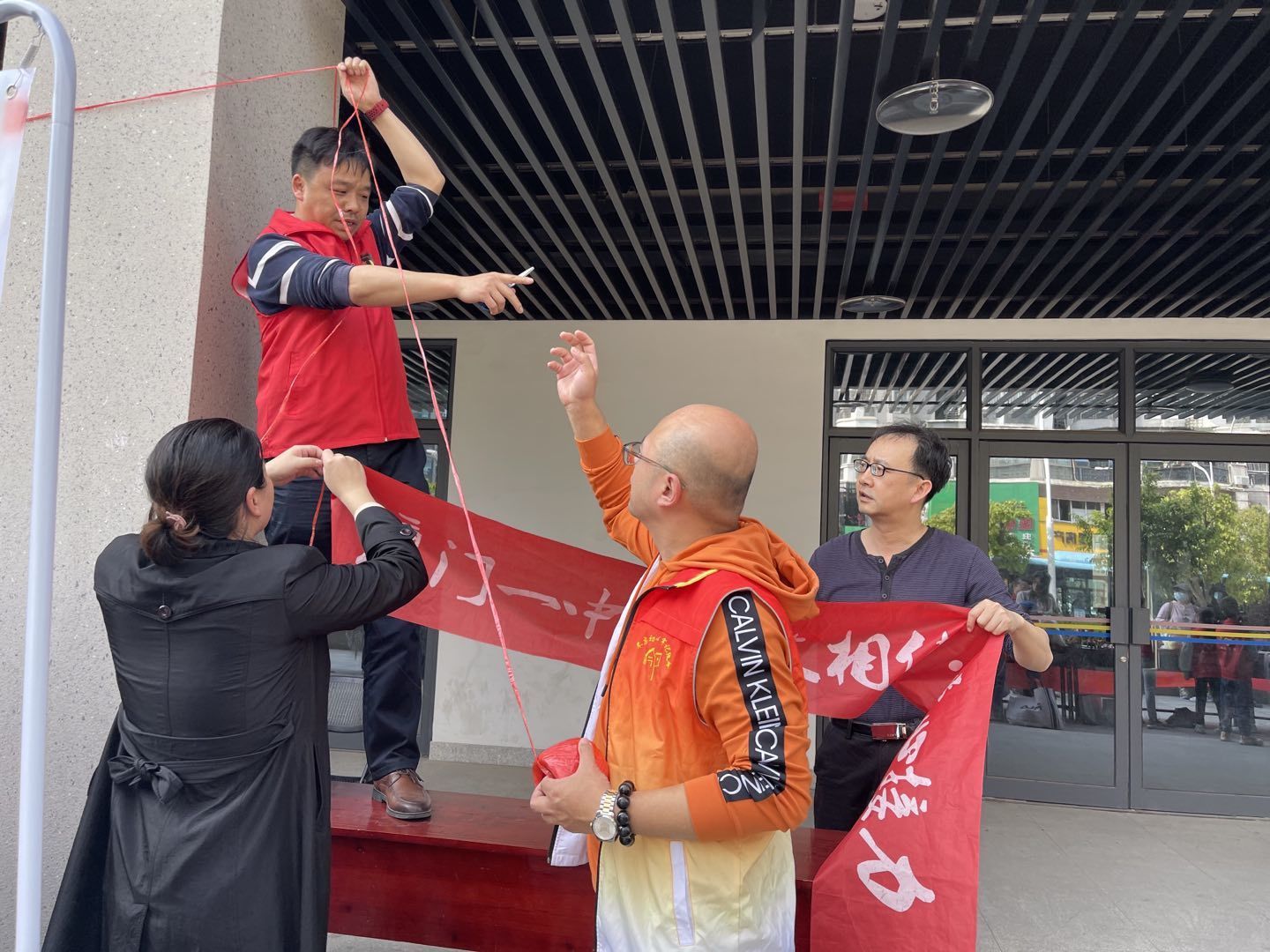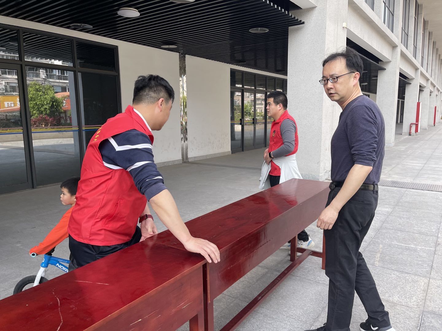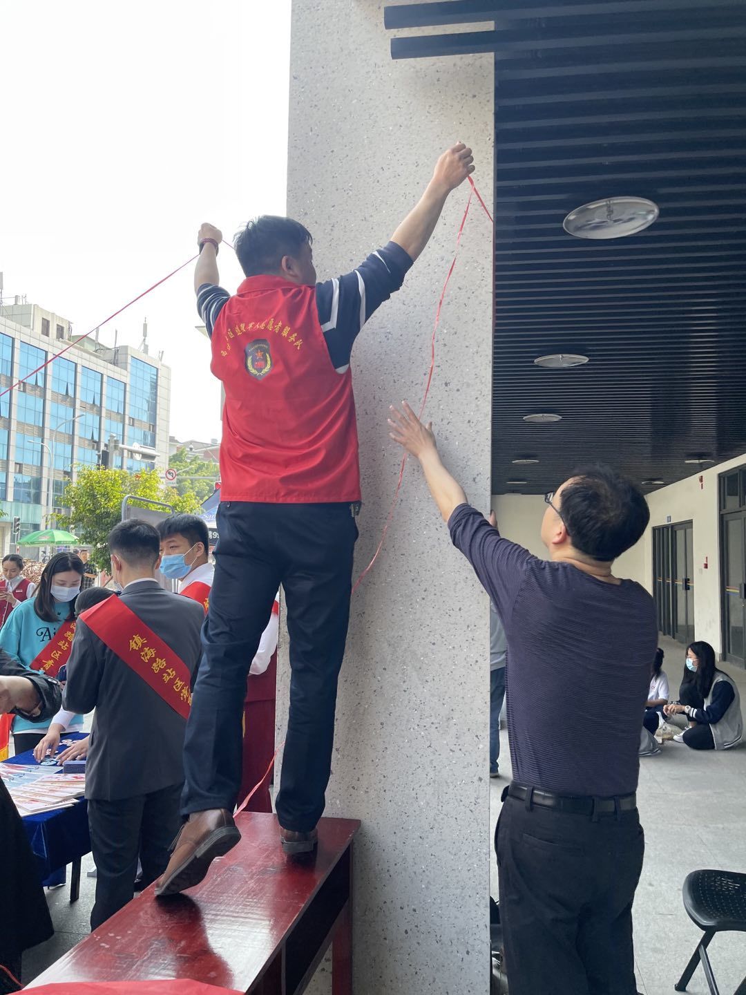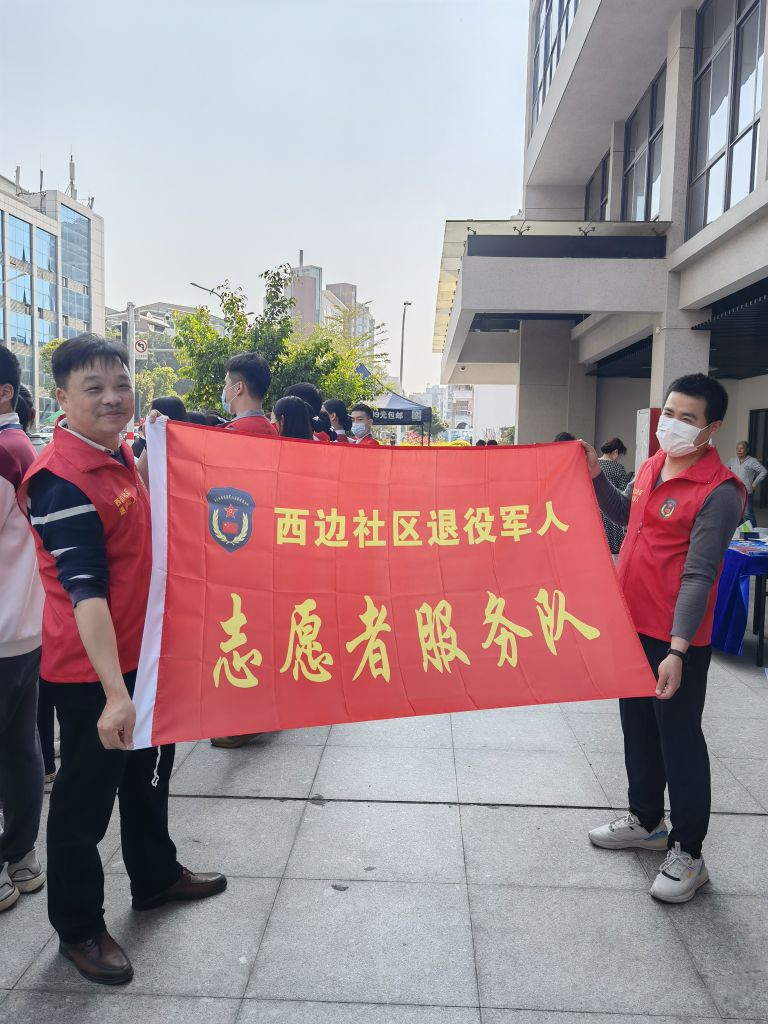 西边社区退役军人服务队和社区工作人员做活动前的准备。