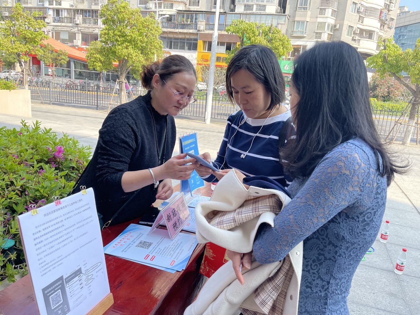 社区工作人员现在宣传疫苗接诊要求,并帮助现场居民注册预约。