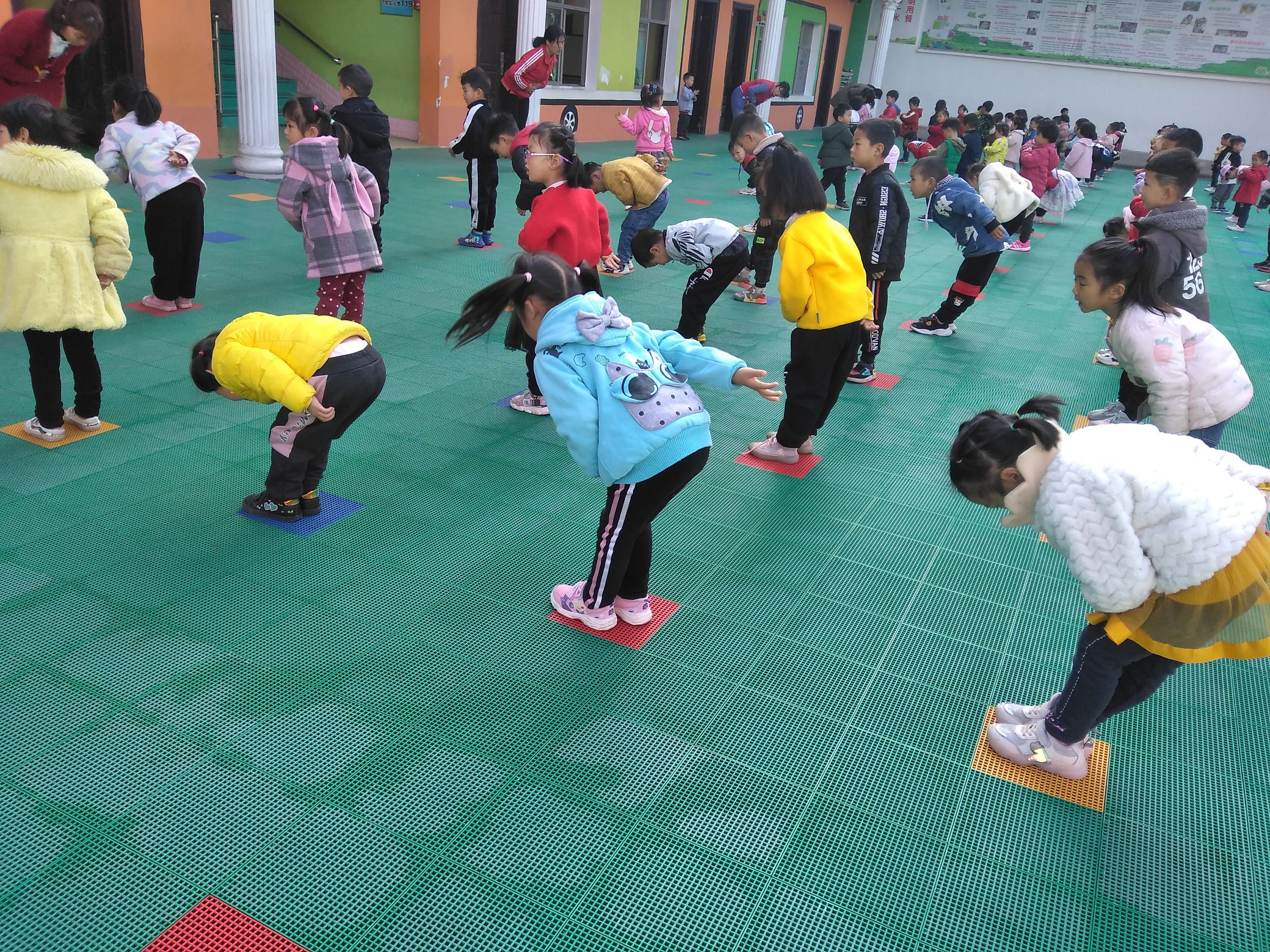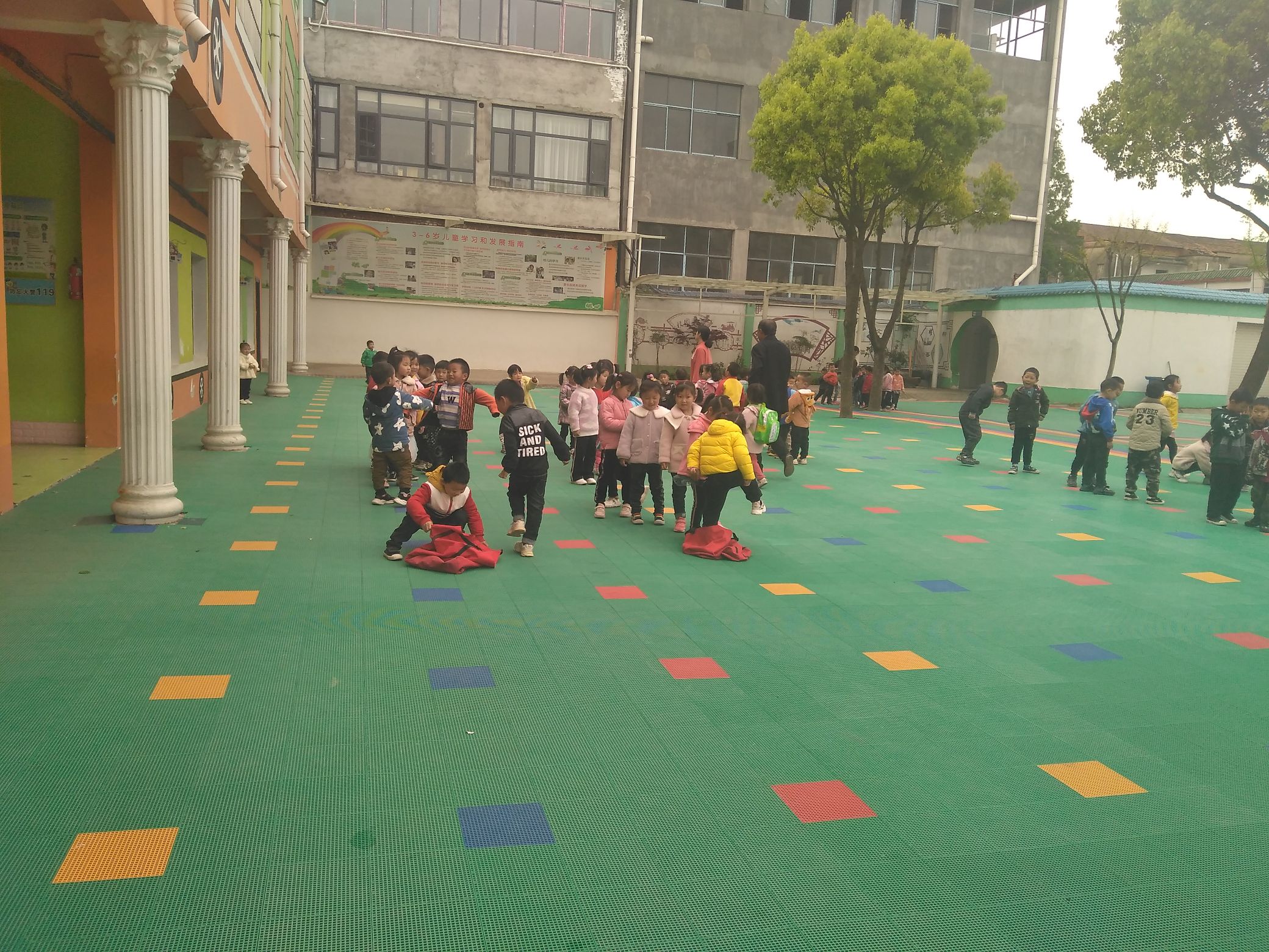 阳光明媚,在老师的带领下,我们在玩袋鼠跳,锻炼我们身体的平衡能力.
