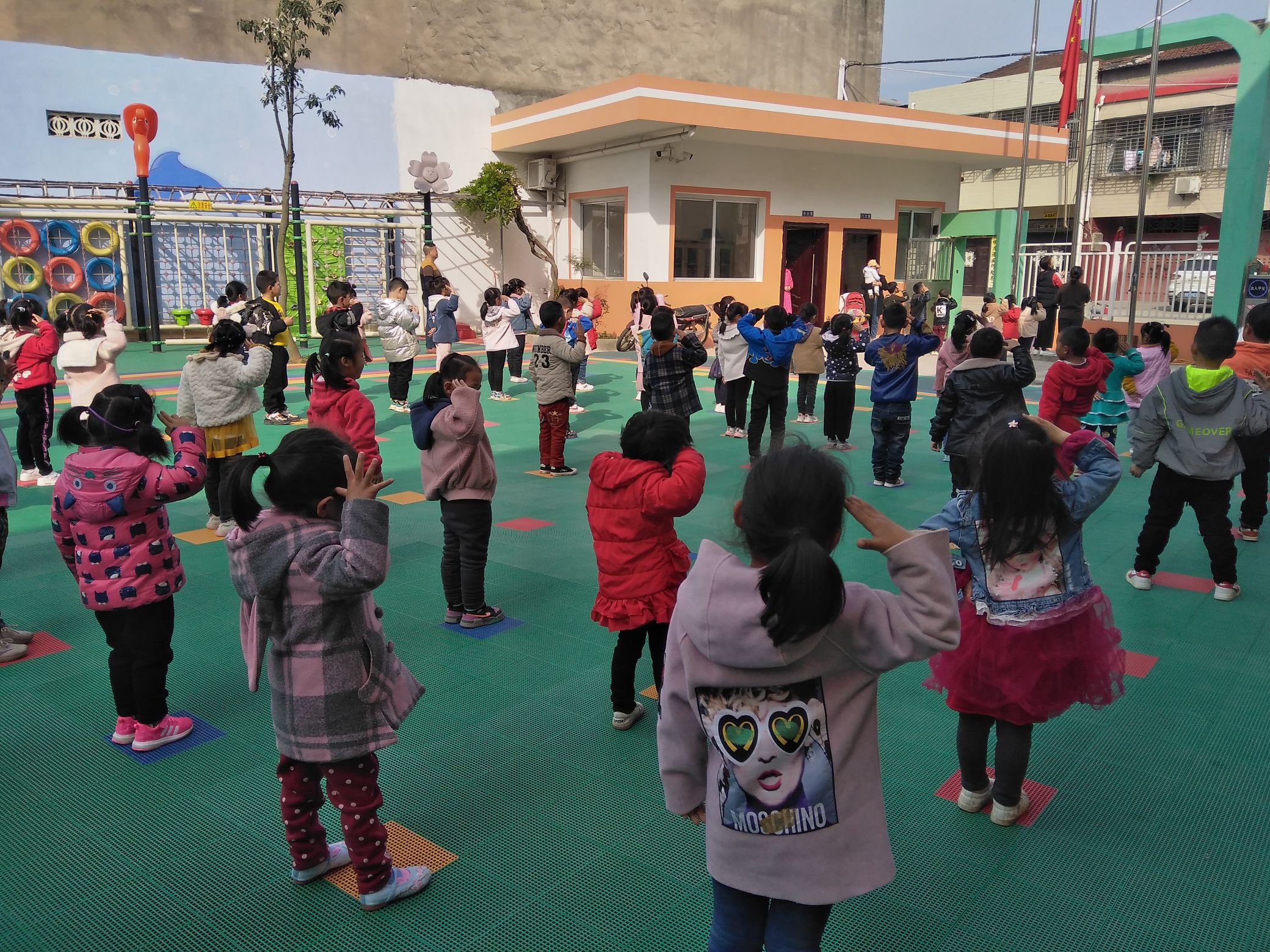 升完国旗我们在认真的做早操,我们都是喜欢锻炼的小朋友.