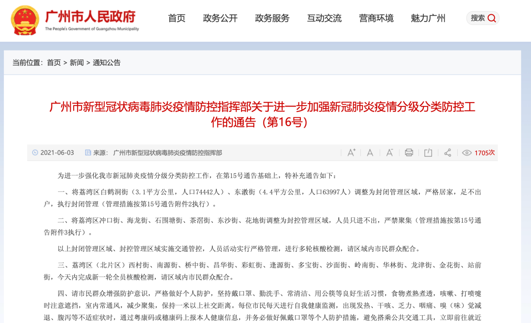 6月3日下午4时许,广州市新型冠状病毒肺炎疫情防控指挥部发布《广州市新型冠状病毒肺炎疫情防控指挥部关于进一步加强新冠肺炎疫情分级分类防控工作的通告(第16号)》。