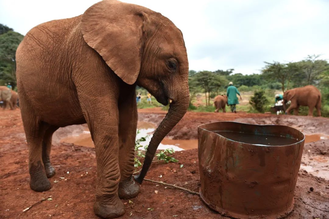 2015年8月6日,在肯尼亚内罗毕市郊的“大象孤儿院”,一头小象准备喝水。