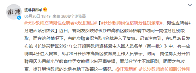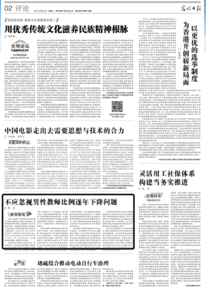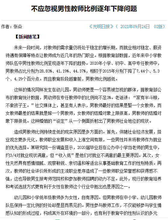文章指出:根据教育部数据,近年来中小学教师队伍中男性教师比例呈现逐年下降的趋势。2020年小学、初中、高中专任教师中,